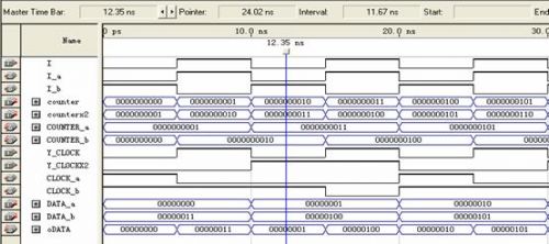 使用的信號包括:數據信號data_a,dat_b;讀寫有效信號wren_a,wren_b;地址信號address_a,address_b;時鐘信號clock_a,clock_b;輸出數據信號q_a,q_b?梢钥吹剿械男盘柖际浅蓪Τ霈F(xiàn)的,就是為了進行乒乓方式的數據傳輸。分成了兩個RAM區(qū)域,A和B,相當于前面講乒乓方式里的數據緩沖模塊1和2。兩個RAM塊是交替著讀寫(由I_a和I_b決定),輸出數據流也是由I決定。剛說到寫時鐘是13.5M,讀時鐘是27M,所以clock_a和clock_b必須是讀寫時鐘切換著輸入,而且地址的計數也不一樣,寫周期時候地址增加的時鐘是13.5M,讀周期地址增加的時鐘是27M。所以每行的數據讀了兩遍,相當于隔行變逐行。圖6在Qartus II下RAM的乒乓操作功能仿真圖: