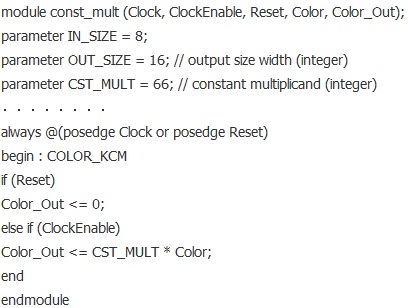 模塊csc.v中,調用const_mult模塊,通過參數傳遞改變參數IN_SIZE,OUT_SIZE,CST_MULT的值,然后實現(xiàn)加法運算。