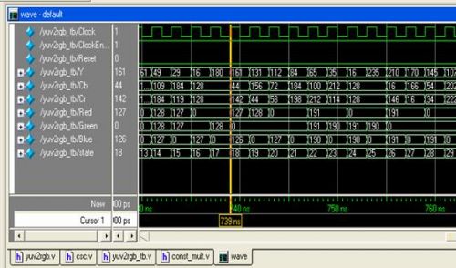 主模塊yuv2rgb實現(xiàn)子模塊的調用,用Modelsim進行了仿真。仿真波形如圖7所示: