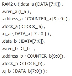 方法2 可以這樣實現(xiàn):在FPGA內部使用Megacore,構造一個雙口的RAM,雙口RAM的輸入輸出信號的硬件描述語言定義如下: