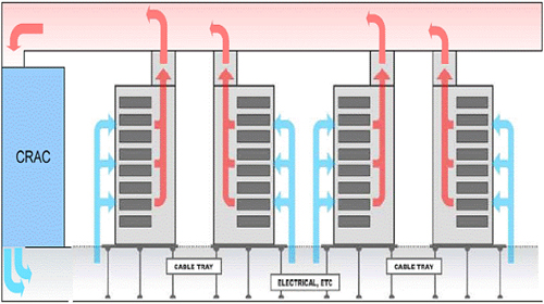 追求更低前期成本和更高運(yùn)行效率的公司可以安裝被動(dòng)式冷卻系統(tǒng)。它們的機(jī)殼上裝有一個(gè)氣密的后門和煙囪,用于收集來(lái)自服務(wù)氣的熱排風(fēng),并將其直接引導(dǎo)至CRAC裝置上的回風(fēng)管道中。然后,CRAC裝置對(duì)排風(fēng)進(jìn)行冷卻并重新循環(huán)。被動(dòng)式系統(tǒng)要求機(jī)柜從前到后都具有較強(qiáng)的氣密性,以便與由CRAC裝置進(jìn)入的冷風(fēng)混合的服務(wù)器熱風(fēng)盡量少。通過比普通的熱-冷通道技術(shù)更徹底地分離冷風(fēng)和熱風(fēng),設(shè)計(jì)合理的被動(dòng)式冷卻系統(tǒng)甚至能以低成本使灼熱的30kW服務(wù)器機(jī)柜在安全溫度下運(yùn)行。