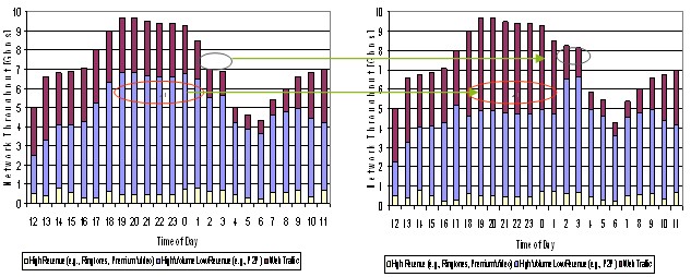 合理調配資源是指應用智能管道技術,并結合激勵型市場定價,運營商能夠減少網絡空載時間或降低低載率,在網絡忙時留出更多的資源給高付費用戶和業(yè)務,從而在相同的資源下獲得更高的收益。下圖是某運營商引入智能管道前后的數(shù)據(jù)分布效果圖,忙時高付費業(yè)務增加,非忙時總業(yè)務量增加(主要來自于低付費業(yè)務),這些都為運營商帶來了額外的收入。實際增收效果會因智能管道策略的力度和動態(tài)調整的效果而有不同,通常都會增加幾個百分點甚至更高。
