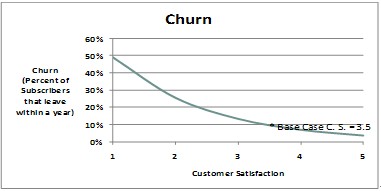 部署智能管道可以在網絡容量和業(yè)務保障方面產生積極影響。針對高端用戶提供免溢價的高價值服務/業(yè)務,會提高高端用戶群體的滿意度。高端用戶是高額利潤的保障,是所有運營商爭取的目標,而用戶滿意度是決定他們是否留在網絡的最重要因素。應用智能管道后,預期年離網率將下降1%~2%。離網率的降低,將使用戶平均停留在本網絡的周期加長,從而增加收入并減少新用戶的獲取成本。這一部分的價值和意義,將大于資源合理分配和差異化業(yè)務的價值。下面的圖表顯示了離網率和用戶滿意度的關系。