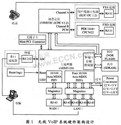 系統(tǒng)硬件的整體架構(gòu)設(shè)計(jì)如圖1所示。系統(tǒng)硬件主要由五部分組成:ADM5120主處理器部分、通話控制部分、無(wú)線子卡部分、存儲(chǔ)部分和外設(shè)連接部分。通話控制部分采用Infineon公司語(yǔ)音芯片VINETIC-2CPE,Version 2.1(PEB3322)為子處理器,外接A/D,D/A轉(zhuǎn)換功能的用戶接口電路SLIC-DC PEB4268,與存儲(chǔ)部分一起構(gòu)成語(yǔ)音實(shí)時(shí)處理骨架;無(wú)線子卡部分采用Atheros公司的WMIA-165G 802.11g Mini PCI模塊,并用Madwifi驅(qū)動(dòng)無(wú)線子卡;存儲(chǔ)部分使用2塊SDRAM存儲(chǔ)器和1塊NOR FLASH存儲(chǔ)器;外設(shè)連接部分包括一個(gè)WAN口和四個(gè)LAN口、Mini-PCI接口、輸出模擬電話信號(hào)的RJ-11接口,以及用于調(diào)試的RS 232串口。