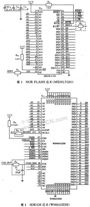 系統(tǒng)存儲(chǔ)模塊包括1塊NOR FLASH芯片MX29LV320和2塊SDRAM芯片W986432DH。MX29LV320的引腳分布如圖3所示。