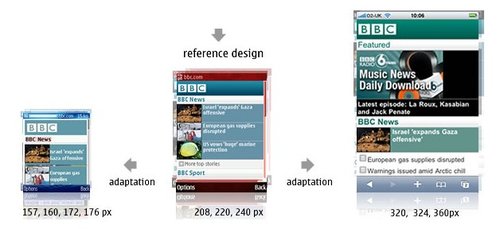 BBC還可以為特定的設(shè)備(或是一組設(shè)備)重新編排一些內(nèi)容。iPhone有非常豐富的功能,因此iPhone版的BBC還有音樂下載選項(xiàng),而其他的設(shè)備可能只會(huì)顯示今天最熱門的‘BBC新聞’。可以根據(jù)數(shù)據(jù)的大小,多媒體的處理能力甚至是屏幕的尺寸決定是否需要針對(duì)iPhone提供更加豐富的內(nèi)容。以Nokia 6680上的‘特色’顯示為例,它大部分的顯示內(nèi)容是讓用戶滾動(dòng)屏幕查看今天最熱門新聞故事。iPhone上顯示了三個(gè)新聞故事,而其中只有一篇配有插入。這使得用戶無需滾動(dòng)屏幕就可以大致了解全部的咨詢。