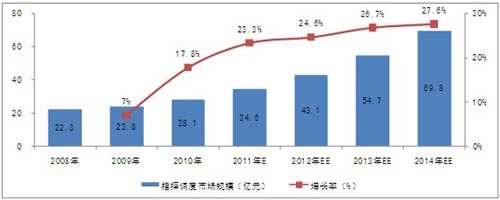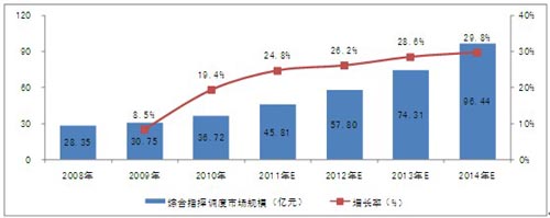 根據(jù)對下游行業(yè)的調(diào)研和關聯(lián)市場的分析,2010年,中國指揮調(diào)度市場規(guī)模已達到28.1億元。隨著下游行業(yè)投資規(guī)模的擴大、產(chǎn)品的升級換代及技術的發(fā)展,行業(yè)市場規(guī)模將保持較快的增長速度,未來4年的復合增長率為26.31%,2014年,市場規(guī)模將達到69.8億元。