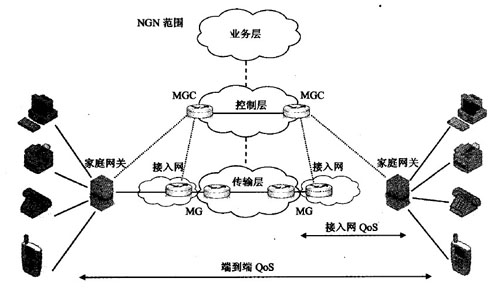 RG也是整個家庭網絡與外部網絡聯系的橋梁,是數字家庭各種業(yè)務和應用的關鍵。ITU-T 已經將家庭網絡納入NGN(新一代網絡)的一部分,而RG將在其中扮演重要角色,RG在NGN中的位置及其與外部的連接如圖2所示,MGC為媒體網關控制器,MG為媒體網關。