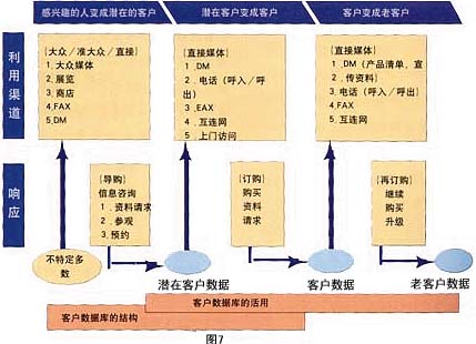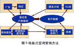 ——銷售支持:東京煤氣公司擁有三種主要的家用產(chǎn)品:地板式空調(diào),煤氣暖氣及煤氣衣服干燥機(jī)。此公司于1993年開始運(yùn)用數(shù)據(jù)庫(kù)營(yíng)銷,現(xiàn)已取得了驕人的成果。其中主力產(chǎn)品——地板式空調(diào),盡管周期長(zhǎng)、價(jià)格高,1997年一年就銷售了3萬(wàn)6千套,同時(shí)從對(duì)這些用戶調(diào)查的結(jié)果發(fā)現(xiàn)“滿意”的占96%。下面介紹一下“地板式空調(diào)”的營(yíng)銷方法(見圖5)