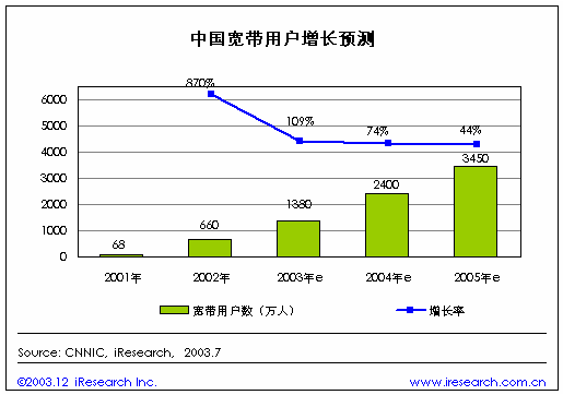進入2003年下半年,幾乎所有人都可以明確地感受到中國寬帶市場的不斷升溫。中國電信、中國網(wǎng)通這兩大運營商以爭奪寬帶用戶、擴大市場占有率為目標的價格戰(zhàn)全面打響,并且日趨白熱化。寬帶接入的價格門檻以令人難以置信的速度不斷下調(diào)。與此同時,寬帶用戶的數(shù)量則呈現(xiàn)雪崩式激增,一條以寬帶運營商為龍頭,涵蓋軟件提供商、互聯(lián)網(wǎng)內(nèi)容服務商、計算機生產(chǎn)商、設備制造商等在內(nèi)的寬帶產(chǎn)業(yè)鏈正在迅速形成,并且不斷壯大。中國的寬帶市場進入前所未有的繁榮期。