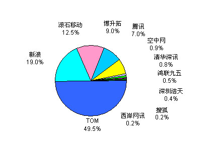 從國內(nèi)移動IVR市場第一季度各SP的收入情況看,一季度收入超過千萬的只有TOM和新浪。其中TOM平均月收入超過1000萬;新浪平均月收入在480萬左右。從市場份額來看,TOM遙遙領(lǐng)先,接近50%的市場份額;其次是新浪,占到19%的市場份額。滾石移動和博升拓是最早進入移動IVR市場的SP之一,市場份額分別為12.5%和9%左右;騰訊由于其特殊的用戶資源,雖然進入移動IVR市場的時間相對稍晚一點,但業(yè)務增長很快,市場份額在7%左右。通過對各SP移動IVR市場份額的分析可以看出,目前移動IVR業(yè)務的市場集中度相對較高,以上這五家SP占到總市場份額的97%左右。