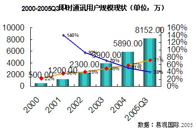 從1999年騰訊推出 OICQ 開始,短短幾年時(shí)間中,即時(shí)通信用戶數(shù)量迅速增長(zhǎng)。在2000年至2004年期間,年增長(zhǎng)率分別為140%、92%、70%和51%。根據(jù)易觀國(guó)際大樣本調(diào)研的結(jié)果,到2005第三季度中國(guó)即時(shí)通訊用戶數(shù)量增長(zhǎng)到8,152萬(wàn),比去年增長(zhǎng)38%。