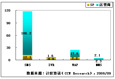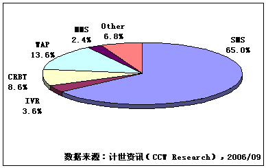 計(jì)世資訊(CCW Research)數(shù)據(jù)顯示,2006年第二季度,移動(dòng)增值業(yè)務(wù)市場規(guī)模達(dá)到182億元人民幣,移動(dòng)增值業(yè)務(wù)指依托移動(dòng)通信網(wǎng)絡(luò)所提供的基本服務(wù)而開展的增值數(shù)據(jù)業(yè)務(wù)服務(wù),市場規(guī)模包括移動(dòng)運(yùn)營商和服務(wù)提供商(SP)收入。其中SMS、IVR、CRBT、WAP和MMS市場規(guī)模分別為118.3、6.5、15.7、24.8和4.4億元人民幣,其他移動(dòng)增值業(yè)務(wù)市場規(guī)模12.3億元人民幣,包括JAVA、BREW、移動(dòng)定位等業(yè)務(wù)。