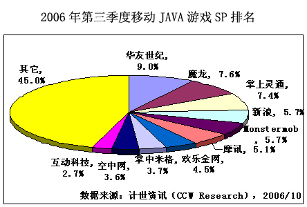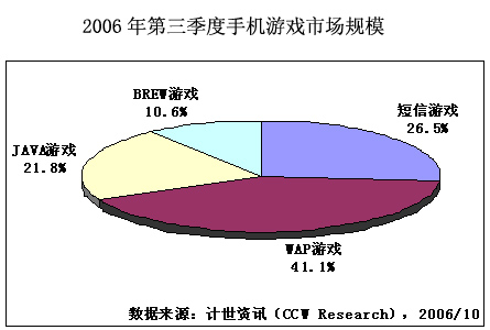 計世資訊(CCW Research)數(shù)據(jù)顯示,2006年第三季度中國手機游戲市場規(guī)模達到6.7億元人民幣,比第二季度增長11.9%。 手機游戲市場規(guī)模包括移動運營商、手機游戲服務提供商在手機游戲業(yè)務上的總體收入,但不包括手機游戲軟件開發(fā)商的收入。第三季度,短信游戲增速繼續(xù)放緩,短信游戲市場規(guī)模達到1.8億元,占手機游戲市場份額的26.5%。WAP,JAVA和BREW游戲繼續(xù)保持快速增長,第三季度WAP、JAVA和BREW游戲市場規(guī)模分別為2.8億元、1.4億元和0.7億元。