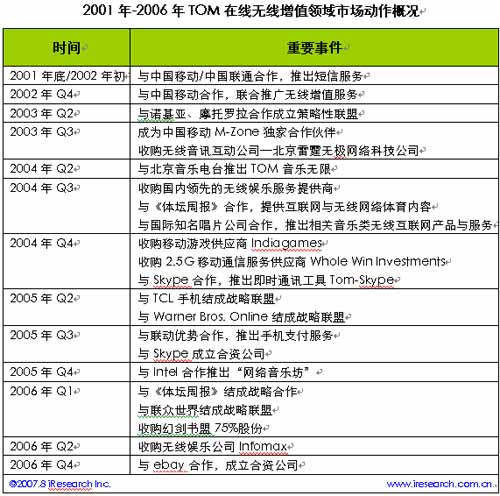 2000年中,TOM在線正式推出,這家一開始便以無線增值為特色的企業(yè)符合了當時中國互聯(lián)網(wǎng)市場的環(huán)境,那時無線增值業(yè)務如火如荼,第五媒體的概念呼之欲出。隨后,便開始了與各大無線媒體、傳統(tǒng)媒體等一系列的合作和收購,所涉及的領(lǐng)域涵蓋短信、無線音樂、手機游戲、手機支付、手機體育新聞、即時通訊等許多行業(yè),一個龐大的無線媒體帝國看似已經(jīng)牢不可破。直到,2006年第四季度與ebay易趣合并,開始涉足電子商務。