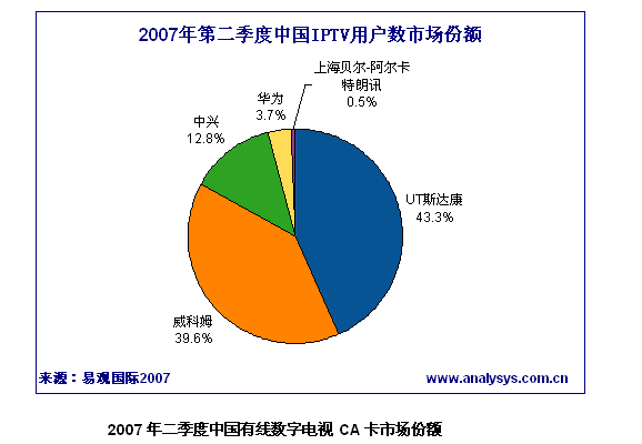 易觀國際研究表明,2007年第2季度中國IPTV用戶數(shù)達到73.6萬,根據(jù)各廠商中標業(yè)務區(qū)實際發(fā)展的用戶數(shù)排名,UT斯達康占據(jù)第一,河南廠商威科姆占據(jù)第二,中興通訊位居第三。