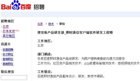 百度有意推IM產品的傳聞由來已久,不過該傳聞一直未得到官方證實。但在其官網最新公布的招聘頁面中,百度已向外界羅列出即時通信客戶端軟件研發(fā)工程師(搜索新產品研發(fā)部)、即時通信軟件產品經理(客戶端軟件業(yè)務部)等職位,上述工作地點均在北京,可見百度的IM戰(zhàn)略布局已具雛形。