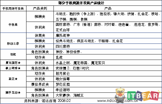 目前國內(nèi)市場上運(yùn)行的手機(jī)網(wǎng)游不下百種,單就手機(jī)網(wǎng)游開放來說,國內(nèi)還沒有哪家或哪幾家開發(fā)商控制占據(jù)絕對優(yōu)勢的局面。下表列出了幾家手機(jī)網(wǎng)游開發(fā)商開發(fā)的手機(jī)網(wǎng)游產(chǎn)品。從表中可以看出中科奧開發(fā)的產(chǎn)品數(shù)量較多(18款),主要產(chǎn)品為棋牌與休閑類小游戲。其他的開發(fā)商開發(fā)的手機(jī)網(wǎng)游產(chǎn)品數(shù)量在2—5款之間,多為大型游戲。從游戲品種的不同可以看出主要開發(fā)商的研發(fā)方向有所區(qū)別。