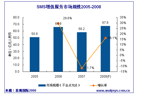 2007年SMS增值服務的市場規(guī)模(不含點對點)達到58.2億,環(huán)比下降了11.7% ,市場下降的主要原因包括: