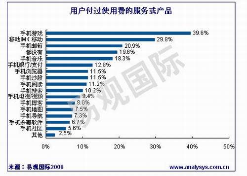 據(jù)易觀國際《中國手機應用市場用戶調研報告2008》研究發(fā)現(xiàn),用戶付過使用費的手機應用服務及產(chǎn)品中,手機游戲、移動IM和手機郵箱的比例較高。其中39.6%的手機應用用戶付費玩過手機游戲,29.8%的用戶曾經(jīng)為移動IM付費,而手機郵箱的付費用戶將達20%。其他手機應用產(chǎn)品或服務中,付費用戶的比例相當,均在10%左右,但是有近20%的用戶沒有用過任何的付費服務或產(chǎn)品。