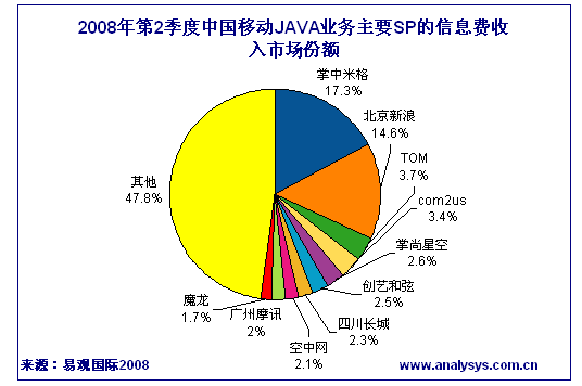 易觀國際近期發(fā)布《2008年第2季度中國手機游戲市場季度監(jiān)測》顯示:中國移動JAVA業(yè)務(wù)SP信息費方面,掌中米格、北京新浪分居前兩名,兩者市場占有率已提高至31.9%。其中掌中米格信息費季度收入達到2505.86萬元,市場占比為17.3%,而新浪信息費收入市場占比為14.6%。信息費收入的第3至第5名依次為TOM、com2us、掌尚星空,三者總市場占比為9.7%。