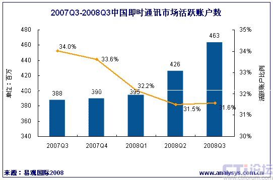 2008年第3季中國(guó)即時(shí)通訊活躍帳戶數(shù)達(dá)4.63億