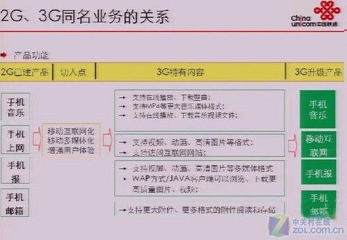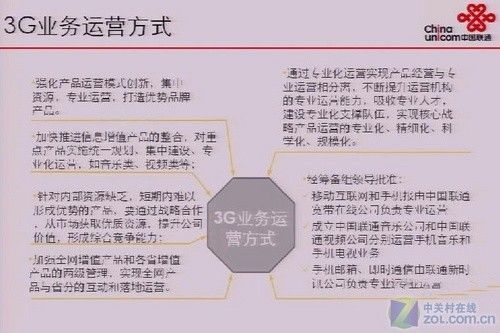 前不久,有論壇網(wǎng)友曝光了幾張聯(lián)通內(nèi)部3G培訓所用的PPT截圖,其中不僅提到了聯(lián)通3G業(yè)務的運營方式,2G/3G同名業(yè)務的關系,還再一次強調(diào)了聯(lián)通將重點推廣的3類九項主要3G業(yè)務。這和筆者前段時間為大家曝光的《官方Flash動畫:解析聯(lián)通3G九大特色業(yè)務》所提到的聯(lián)通9大特色3G業(yè)務保持一致。