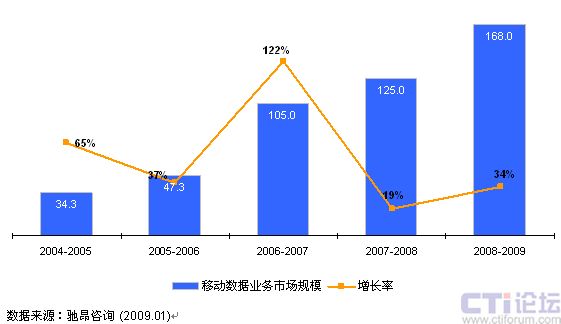 2008年中國移動數(shù)據(jù)業(yè)務市場規(guī)模達168億美元