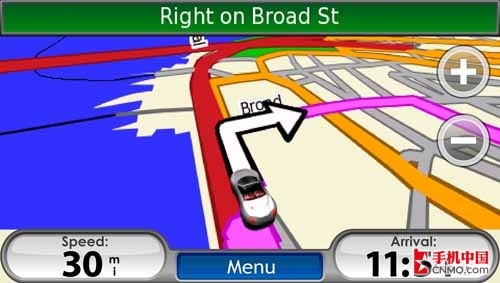 色彩豐富的界面、臨場(chǎng)感十足的導(dǎo)航界面,是Garmin Nuvifon帶給用戶的全新導(dǎo)航體驗(yàn)。用超酷的跑車來表現(xiàn)目前用戶所處的方位,極具創(chuàng)意之余也更加直觀;用戶也可通過觸摸虛擬按鍵來實(shí)現(xiàn)地圖的放大縮小。
