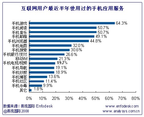 互聯(lián)網(wǎng)用戶近半年使用過的手機(jī)應(yīng)用按比例排列依次是手機(jī)游戲、手機(jī)閱讀、手機(jī)搜索、手機(jī)瀏覽器、移動IM。其中移動互聯(lián)網(wǎng)用戶對手機(jī)游戲的使用率和互聯(lián)網(wǎng)用戶相當(dāng),達(dá)64.3%。具體如上圖:
