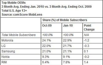 3月11日消息,據(jù)國外媒體報道,全球IT信息服務(wù)提供商comScore公司最近發(fā)布了一項2009年第四季度(2009年10月至2010年1月)美國手機(jī)市場調(diào)查報告。這份報告對手機(jī)原配件生產(chǎn)商(OEMs)及智能手機(jī)操作系統(tǒng)平臺做了相關(guān)的行業(yè)排名,排名依據(jù)為美國市場13歲以上手機(jī)用戶群數(shù)據(jù)的統(tǒng)計,以及用戶手機(jī)使用行為的調(diào)查數(shù)據(jù)。一月份報告顯示摩托羅拉以22.9%的市場份額占據(jù)了第一位。RIM公司則占據(jù)著智能手機(jī)市場43%的市場份額,競爭優(yōu)勢明顯。