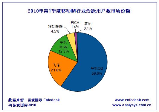 據(jù)易觀國際Enfodesk產(chǎn)業(yè)數(shù)據(jù)庫近期發(fā)布的《2010年第1季度中國市場移動(dòng)IM數(shù)據(jù)監(jiān)測報(bào)告》研究顯示:2010年第1季度中國市場移動(dòng)IM活躍用戶數(shù)環(huán)比增長超過18%,總數(shù)突破1.6億,累計(jì)賬戶數(shù)環(huán)比增長10.97%,總數(shù)超過3.8億,相比09年第4季度依然取得了較快的增長。但是基于整體市場來看,移動(dòng)IM活躍用戶數(shù)市場格局并沒有發(fā)生太大變化,手機(jī)QQ仍然以59.6%的市占率名列市場第一,飛信、手機(jī)MSN位列二三名,具體市場占比及排名如下圖所示: