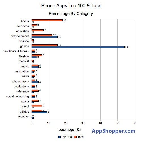 軟件數(shù)量最多的類別是“書(shū)籍”,占軟件總數(shù)的18%,但在Top100排行榜的比例卻為0%;“游戲”占軟件總數(shù)的15%,居第二位,但在Top100排行榜的比例卻高達(dá)54%,高居第一位。