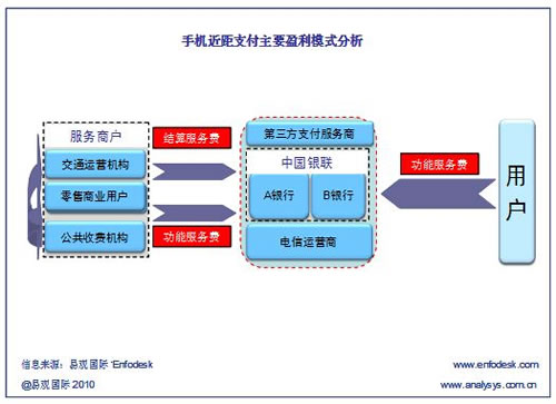 根據(jù)Enfodesk易觀智庫近期發(fā)布的《中國手機支付市場系列專題報告2010——近距支付》報告顯示,手機近距支付的主要盈利模式只有三種:即前向用戶服務(wù)費、結(jié)算手續(xù)費和后向商戶服務(wù)費。