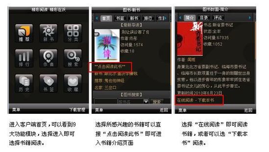 據(jù)了解,中國(guó)聯(lián)通手機(jī)閱讀業(yè)務(wù)分為三個(gè)專(zhuān)區(qū)。目前,圖書(shū)頻道包括16類(lèi)24000余本圖書(shū),雜志頻道包括17類(lèi)500余本雜志。此外,用戶(hù)可選擇進(jìn)入聽(tīng)書(shū)頻道,下載并收聽(tīng)圖書(shū)。