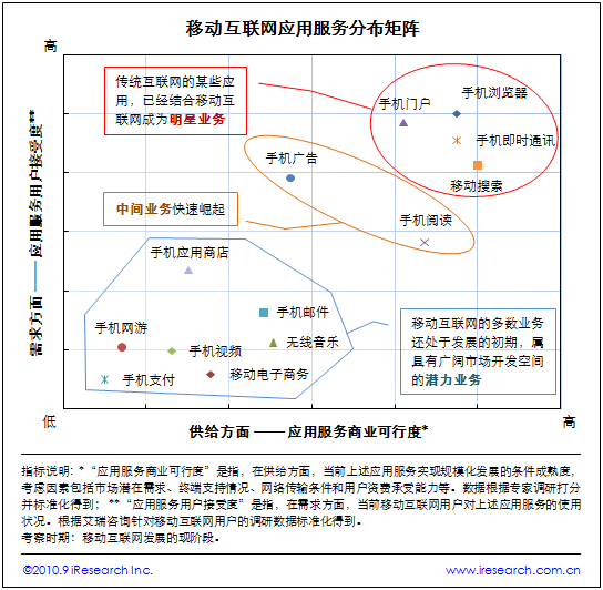 根據(jù)艾瑞咨詢近期發(fā)布的《2009-2010年中國移動(dòng)互聯(lián)網(wǎng)行業(yè)發(fā)展報(bào)告》,移動(dòng)互聯(lián)網(wǎng)各應(yīng)用服務(wù)在“應(yīng)用服務(wù)商業(yè)可行度”和“應(yīng)用服務(wù)用戶接受度”兩個(gè)維度上被劃分為“明星業(yè)務(wù)”、“中間業(yè)務(wù)”和“潛力業(yè)務(wù)”三個(gè)類型。具備一定規(guī);l(fā)展市場(chǎng)條件,但還面臨若干限制因素的移動(dòng)互聯(lián)網(wǎng)業(yè)務(wù),將在未來逐步打開市場(chǎng)。