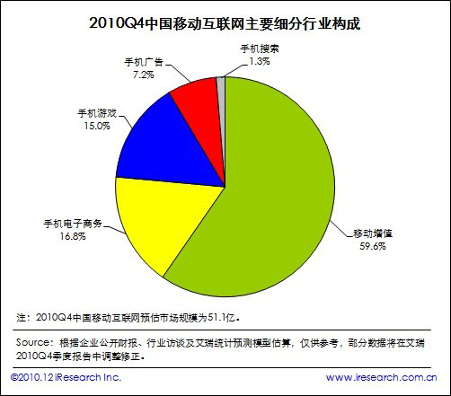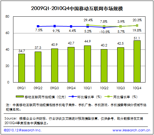 根據艾瑞咨詢即將發(fā)布的2010年第四季度中國移動互聯網市場監(jiān)測數據顯示,2010Q4中國移動互聯網市場整體規(guī)模達到51.1億,同比增長19.8%,環(huán)比增長20.3%。艾瑞咨詢分析認為,本季度電信運營商對計費通道治理開始收尾,移動增值市場整體復蘇。同時手機電子商務、手機游戲業(yè)務領域取得良好市場表現,受手機應用商店、位置簽到服務等新型手機業(yè)務創(chuàng)新的帶動,移動互聯網規(guī)?傮w攀升,投融資比重增加。