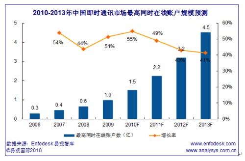 中國即時(shí)通訊市場在發(fā)展過程中日漸趨于穩(wěn)定,但是,隨著騰訊與360之間的爭端,使得即時(shí)通訊市場再次成為業(yè)界關(guān)注的焦點(diǎn)。易觀國際(Analysys International)預(yù)計(jì),2010年中國即時(shí)通訊市場最高同時(shí)在線賬戶規(guī)模將達(dá)1.5億,較2009年增長55%,預(yù)計(jì)到2013年,中國即時(shí)通訊市場最高同時(shí)在線賬戶規(guī)模將達(dá)4.52億,較2012年增長41%。