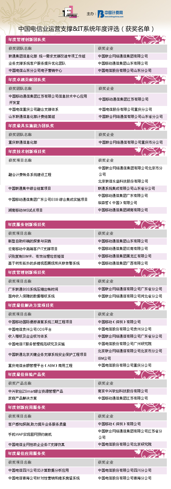由中國計(jì)費(fèi)網(wǎng)(www.billingchina.com)主辦的“Awards2010”第四屆中國電信業(yè)運(yùn)營支撐&IT系統(tǒng)年度評(píng)選活動(dòng)的結(jié)果于2011年元月31日隆重揭曉。自2010年12月1日評(píng)選活動(dòng)正式啟動(dòng)以來,歷時(shí)兩個(gè)月,來自國內(nèi)運(yùn)營商集團(tuán)、省級(jí)公司、IT產(chǎn)品與服務(wù)提供商的42家企業(yè)的優(yōu)秀產(chǎn)品、項(xiàng)目和團(tuán)隊(duì)共計(jì)70份參評(píng)項(xiàng)目入圍評(píng)選。經(jīng)過全面征集、選拔、初審以及評(píng)委團(tuán)的嚴(yán)格評(píng)審,評(píng)選結(jié)果已經(jīng)公示。在30位來自運(yùn)營商IT支撐、業(yè)務(wù)和服務(wù)部門的威權(quán)評(píng)委們的認(rèn)真評(píng)審后,共有27家企業(yè)分別獲得了30個(gè)Awards2010的團(tuán)隊(duì)/項(xiàng)目/產(chǎn)品/應(yīng)用服務(wù)的榮譽(yù)桂冠。