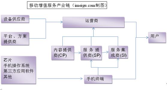 中國電信,中國移動,中國聯(lián)通是中國的三大電信運營商。移動增值服務(wù)和移動支付解決方案已構(gòu)成了移動運營商的兩大收入來源。移動增值業(yè)務(wù)是包括所有增進移動用戶體驗的非話音服務(wù),在中國目前主要的四大移動增值業(yè)務(wù)是:短信、彩信、WAP和彩鈴業(yè)務(wù)。移動增值業(yè)務(wù)的產(chǎn)業(yè)鏈如下圖所示: