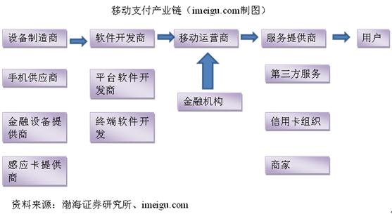 移動支付業(yè)務(wù)產(chǎn)業(yè)鏈主體由設(shè)備制造商、銀行、信用卡組織、移動運營商、移動支付服務(wù)提供商(或移動支付平臺運營商)、商業(yè)機構(gòu)、SIM卡供應(yīng)商、手機供應(yīng)商、用戶等多個環(huán)節(jié)組成。