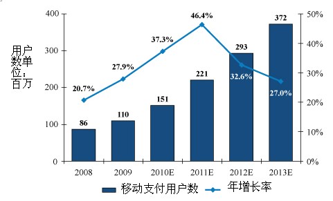 基于“中國計算機世界”的研究預(yù)測,中國移動支付用戶在2009年底達到1.1億,預(yù)計將在2013年超過3倍。由于需求大幅提高,電信運營商會繼續(xù)在每個省推出移動支付解決方案網(wǎng)絡(luò)。反過來,也會刺激第三方平臺和供應(yīng)商的發(fā)展。