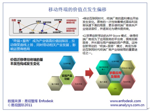 易觀智庫Enfodesk在近期發(fā)布《中國移動互聯(lián)網(wǎng)市場年度綜合報告2011》中認(rèn)為,隨著3G的普及以及多元化移動應(yīng)用的出現(xiàn),智能手機(jī)取代功能手機(jī)已成定勢,導(dǎo)致傳統(tǒng)的移動終端價值點開始由產(chǎn)品化向服務(wù)化遷移。終端廠商原有模式也受到極大挑戰(zhàn)。若不進(jìn)行有效轉(zhuǎn)型恐難以在未來2-3年后的手機(jī)市場生存。