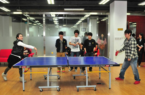 (十八) 5點(diǎn)鐘了啦,可以下班了喔,還是A班的我們幸福,晚班可就熬人啦,但不少時(shí)候?yàn)榱斯ぷ骱臀覀兊能?chē)主客戶,總會(huì)偷偷的說(shuō),“為人為己服務(wù)至上,有付出就會(huì)有回報(bào)……”下班時(shí)間約了同事在公司B2打乒乓球哦~勞逸結(jié)合,放松下,現(xiàn)場(chǎng)觀眾很多的,男同胞很捧場(chǎng),哈哈。