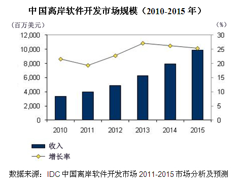 IDC數(shù)據(jù)顯示,2010年中國離岸軟件開發(fā)市場規(guī)模達到33.57億美元,同比增長21.6%,預計未來五年將以24.2% 的復合增長率快速攀升。