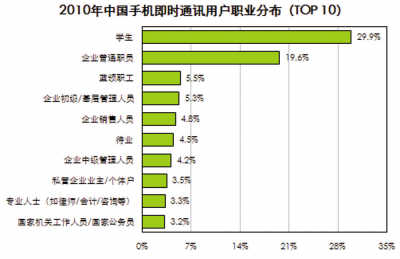 一系列研究數(shù)據(jù)足以說明些問題。研究公司艾瑞咨詢報(bào)告數(shù)據(jù)顯示,2010年中國(guó)手機(jī)上網(wǎng)用戶達(dá)到3.03億,在總網(wǎng)民數(shù)中占比約為66.3%。這其中,57.4%的用戶使用即時(shí)通訊服務(wù),位列手機(jī)上網(wǎng)用戶十大行為的第二位。