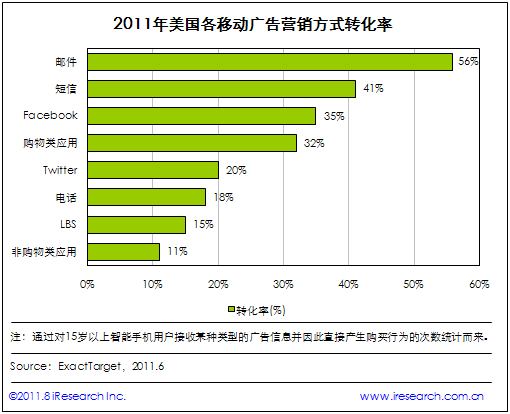 iResearch艾瑞咨詢整理ExactTarget調(diào)研數(shù)據(jù)時(shí)發(fā)現(xiàn):2011年在驅(qū)動(dòng)美國手機(jī)用戶產(chǎn)生購買的移動(dòng)廣告營銷方式中,電子郵件營銷的轉(zhuǎn)化率最高,達(dá)到56%,短信、Facebook、購物類手機(jī)應(yīng)用(如Amazon、eBay、Groupon)以41%、35%、32%的轉(zhuǎn)化率依次位居二、三、四位。