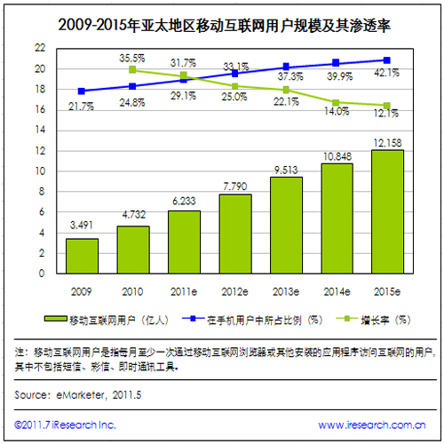 iResearch艾瑞咨詢整理eMarketer數(shù)據(jù)時(shí)發(fā)現(xiàn),2010年亞太地區(qū)移動(dòng)互聯(lián)網(wǎng)用戶規(guī)模達(dá)到4.732億,較2009年增長(zhǎng)35.5%,占手機(jī)用戶總數(shù)的24.8%。預(yù)計(jì)2011年移動(dòng)互聯(lián)網(wǎng)用戶數(shù)將達(dá)6.233億,增幅為31.7%,占手機(jī)用戶總數(shù)的29.1%。在未來(lái)的5年里,亞太地區(qū)移動(dòng)互聯(lián)網(wǎng)用戶規(guī)模增速有所下降,但其在手機(jī)用戶總數(shù)中的比例將進(jìn)一步增加。