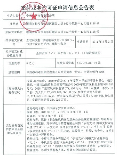 中移動(dòng)申請(qǐng)支付業(yè)務(wù)許可證 湖南移動(dòng)全資運(yùn)營(yíng)