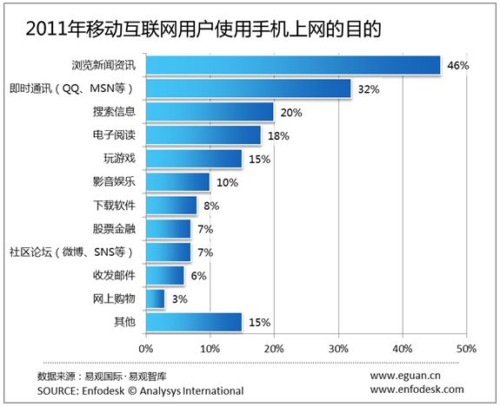 CTI論壇(ctiforum)9月1日消息(記者 潘婷婷):根據(jù)易觀國(guó)際對(duì)于中國(guó)移動(dòng)互聯(lián)網(wǎng)用戶最新調(diào)研數(shù)據(jù)顯示,2011年移動(dòng)互聯(lián)網(wǎng)用戶使用手機(jī)上網(wǎng)的目的中,瀏覽新聞資訊、即時(shí)通訊是集中度最高的兩個(gè)選擇,均占比30%以上,搜索信息、閱讀和玩游戲是用戶選擇的第二梯隊(duì),第三梯隊(duì)則是影音娛樂、下載軟件,股票金融和社交。